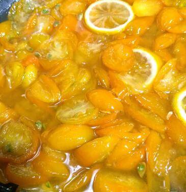 3、腌好的金桔柠檬倒入锅内,加150毫升水中小火煮开,小火慢炖,中间经常翻拌,防止糊锅。