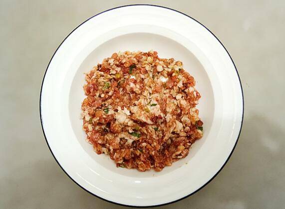 肉末中加入葱、姜粉、白胡椒粉、食盐、生抽、老抽、香油充分拌匀。
