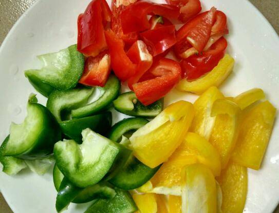 用料:虾250克、青椒半个、红椒半个、黄椒半个、大蒜2瓣、盐1小勺、鸡精半小勺、蚝油半勺、酱油半勺、植物油适量。