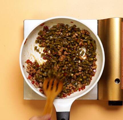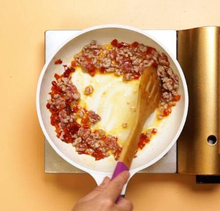 倒入猪肉末,翻炒均匀,倒入料酒,煸炒至肉末变色。