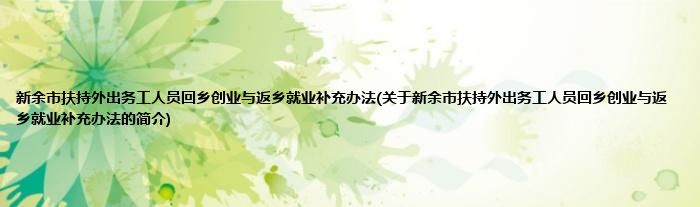 1、 新余市扶持外出务工人员回乡创业与返乡就业补充办法,是为进一步做好外出务工人员回乡创业与返乡就业,落实和完善对回乡创业与返乡就业人员帮扶机制。