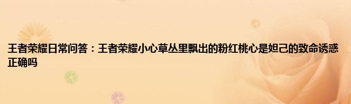 小编今天给各位玩家朋友们带来的是王者荣耀日常问答:王者荣耀小心草丛里飘出的粉红桃心是妲己的致命诱惑正确吗,有记得的玩家朋友吗?不记得也没有关系,小编已经帮助大家把王者荣耀日常问答:王者荣耀小心草丛里飘出的粉红桃心是妲己的致命诱惑正确吗找了出来,你只需要动动你的小手就可以轻松知道啦,快来瞧一瞧吧。